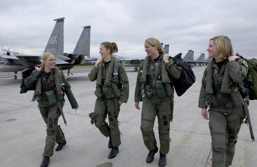Female pilots in the Air Force behind the F-15 fighter jets that they fly. As of 2015, women are permitted in all roles within the armed forces.