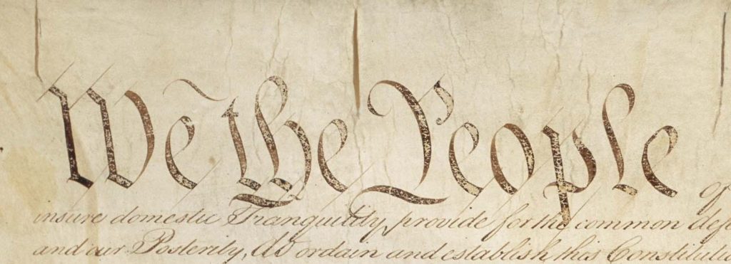 Most famously, however, the Preamble’s first three words explicitly declare that the government’s power is derived from the consent of the citizens. Yet these words – We the People – were followed in the first draft of the Preamble by a listing of all the states. It seems that even then, after having negotiated all the compromises that made national unity possible, Americans still had a hard time thinking of themselves first and foremost as citizens of a singular, unified nation.